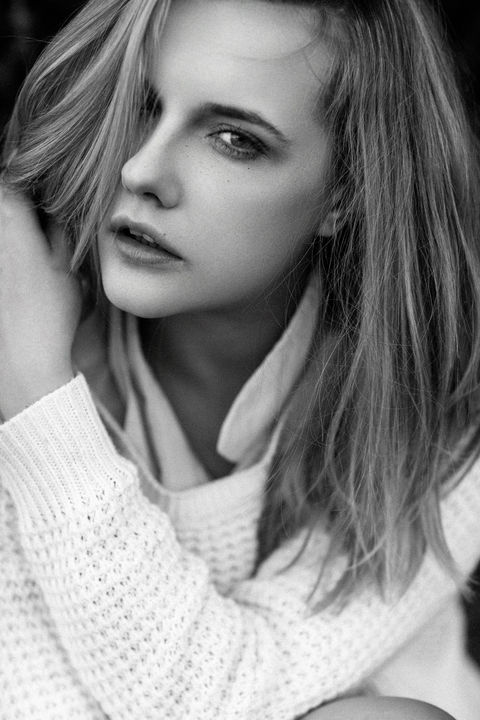 Unretouched beauty close-up of female model with blonde hair and freckles, wearing white knitted jumper.